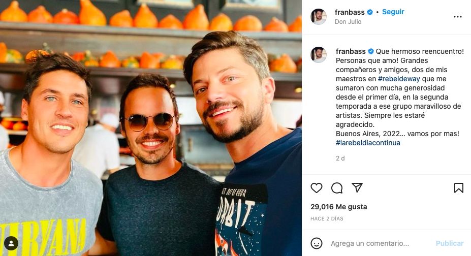 "Qué hermoso reencuentro. Personas que amo. Grandes compañeros y amigos, dos de mis maestros en Rebelde Way que me sumaron con mucha generosidad desde el primer día, en la segunda temporada, a ese grupo maravilloso de artistas. Siempre les estaré agradecido. Buenos Aires, 2022… vamos por más”, escribió Bass junto a la foto con sus dos amigos en una conocida parrilla.