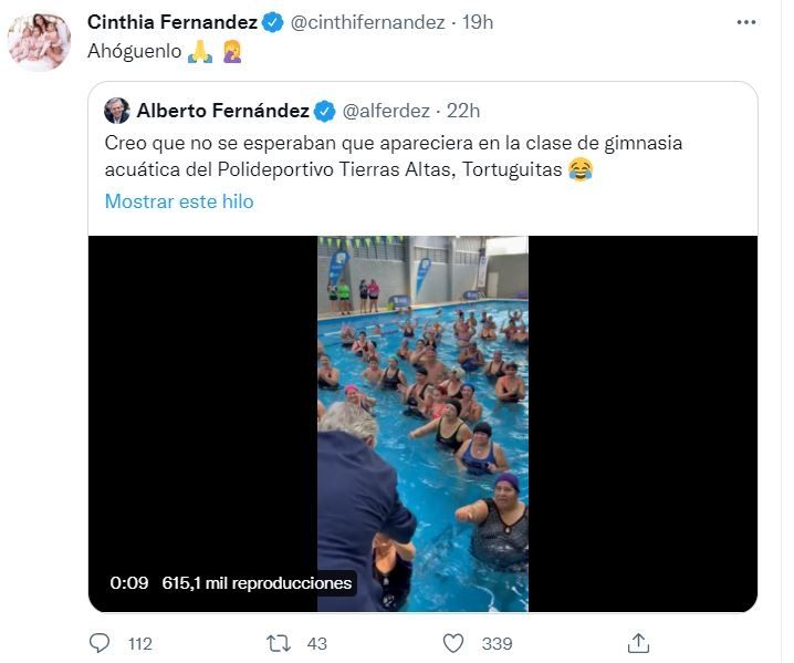 “Creo que no se esperaban que apareciera en la clase de gimnasia acuática del Polideportivo Tierras Altas, Tortuguitas”, escribió divertido el primer mandatario de la Argentina en su cuenta de Twitter, a lo que Cin, muy serena, replicó su posteo con un brutal pedido: “Ahógenlo”.