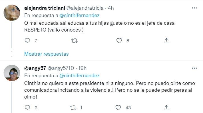 El comentario de la ex angelita de LAM de inmediato se llenó de respuestas, principalmente críticas por el rol que ocupa desde hace varios años en los medios. “Cinthia, no quiero a este presidente ni a ninguno. ¡Pero no puedo oírte como comunicadora incitando a la violencia! ¡No se le puede pedir peras al olmo!”, dijo alguien.