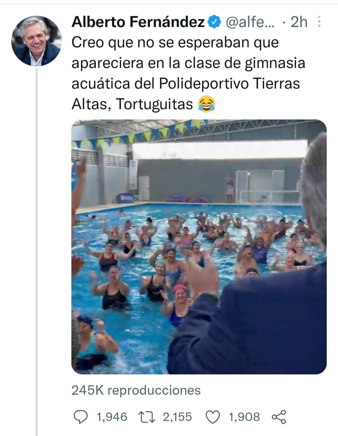 El video que compartió el presidente Alberto Fernández en las redes sociales, desde el Polideportivo Tierras Altas en Tortuguitas, asistiendo a una clase de gimnasia acuática de un grupo de mujeres, es una iniciativa que no pasó desapercibida y generó fuertes ironías. Jorge Lanata no quedó exento del asombro, y este miércoles en Radio Mitre hizo un fuerte descargo.