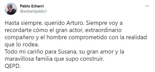 "Hasta siempre, querido Arturo. Siempre voy a recordarte como el gran actor, extraordinario compañero y el hombre comprometido con la realidad que lo rodea. Todo mi cariño para Susana, su gran amor y la maravillosa familia que supo construir. QEPD", escribió Pablo Echarri.