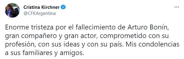 "Enorme tristeza por el fallecimiento de Arturo Bonín, gran compañero y gran actor, comprometido con su profesión, con sus ideas y con su país. Mis condolencias a sus familiares y amigos", expresó Cristina Kirchner en su cuenta de Twitter.