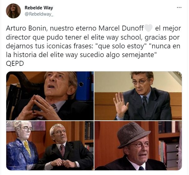 La cuenta oficial de la tira juvenil Rebelde Way también dejó un emotivo mensaje para el actor que interpretó al personaje del director Marcel Dunoff: "Arturo Bonin, nuestro eterno Marcel Dunoff el mejor director que pudo tener el elite way school, gracias por dejarnos tus iconicas frases: "que solo estoy" "nunca en la historia del elite way sucedio algo semejante" QEPD".