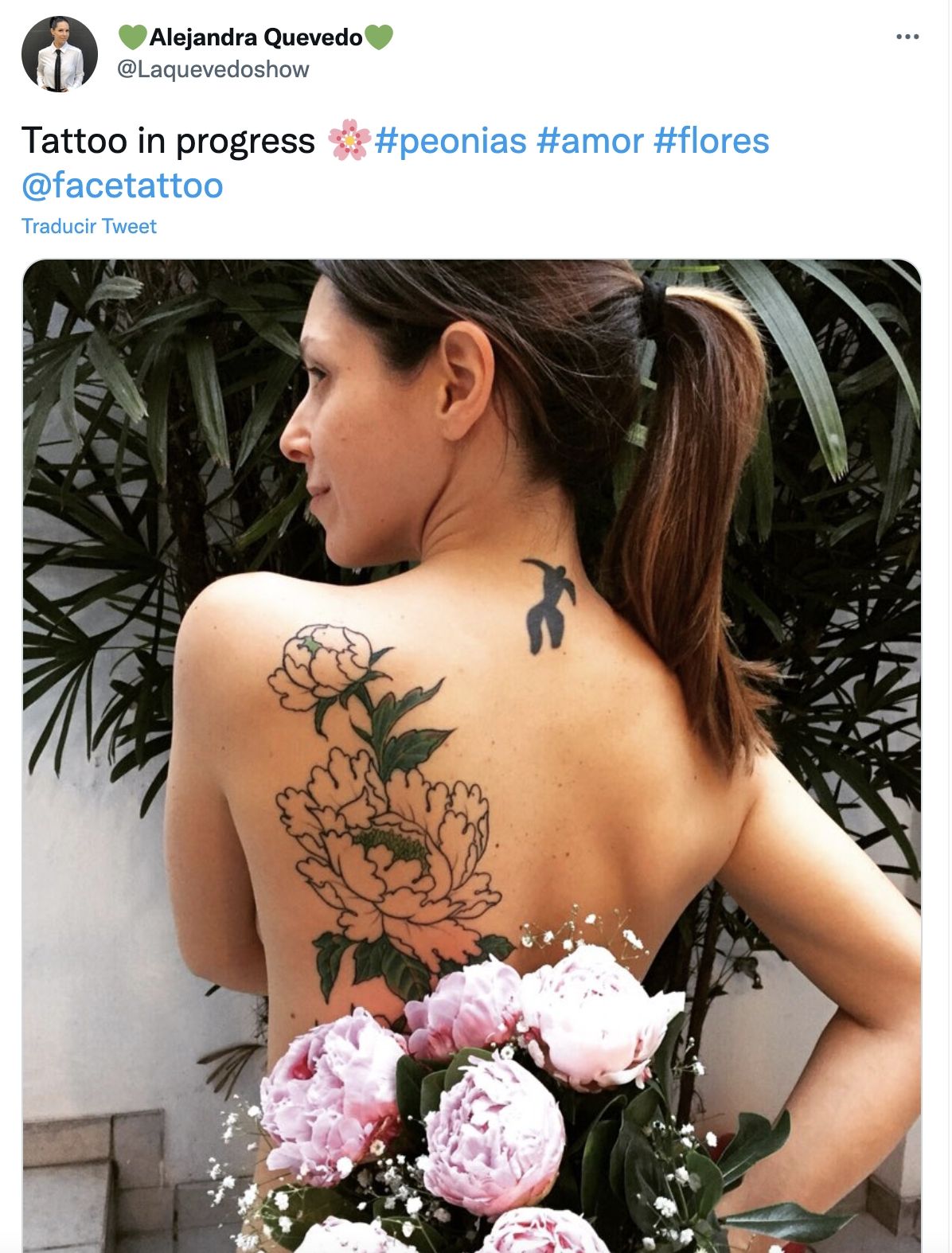 Un grabado que empezó en 2015 y que ha llegado a su versión definitiva, que se caracteriza por un motivo floral de enorme tamaño que acapara desde la cintura hasta los hombros. Alejandra lo luce orgullosa y feliz por el resultado.