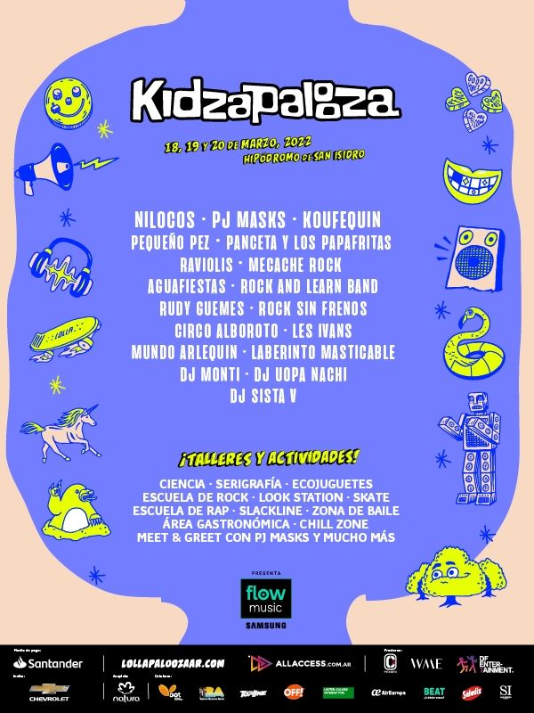 Además de los conciertos pensados para los más pequeños, habrá actividades lúdicas y talleres creativos. El Kidzapalooza funcionará durante las tres jornadas (viernes 18, sábado 19 y domingo 20) entre las 12 y las 19 hs de cada día.