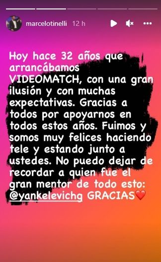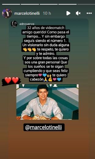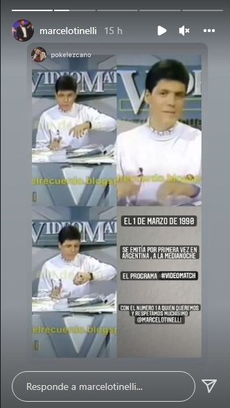 Primero, reposteó una story de Instagram con un collage de fotos. "1 de marzo de 1990 se emitía por primera vez en Argentina, a la medianoche, el programa #VideoMatch, con el número 1 a quien queremos y respetamos muchísimo", decía el texto en el que se arrobaba a Marcelo.