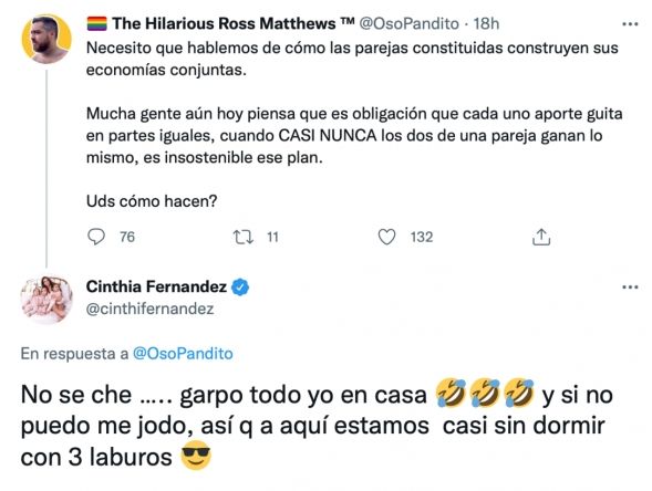 Cinthia está cada vez más activa en Twitter, donde se expresa sobre todo tipo de cuestiones. Fue por esa vía que la panelista decidió responder un tweet que hablaba sobre las parejas que construían la economía familiar en conjunto. Fue ahí que la mediática confió que los gastos de su hogar los paga sola.