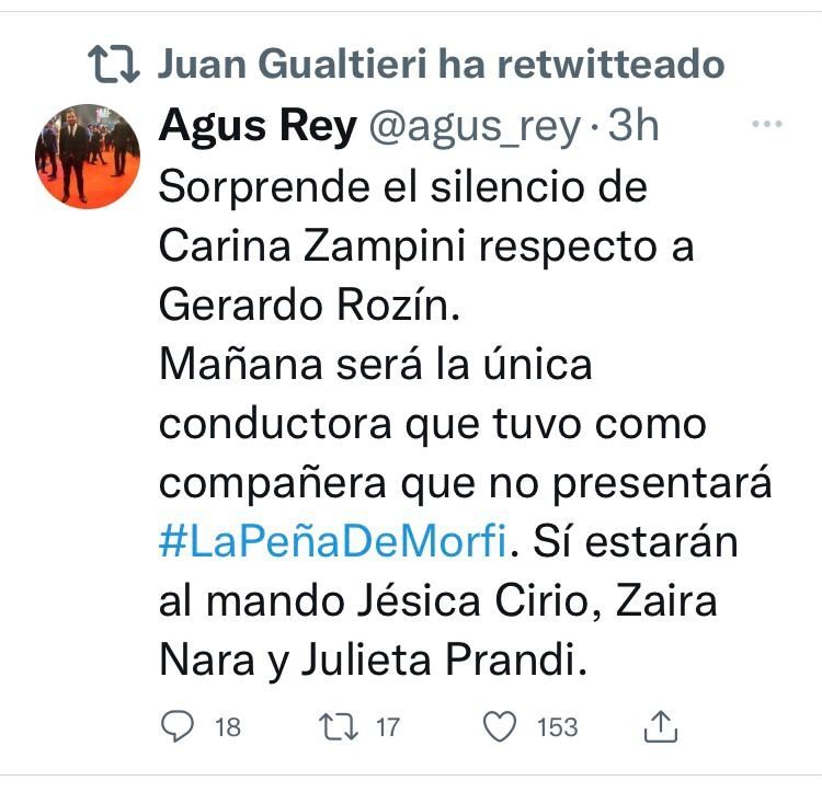 Telefe decidió edificar un programa especial, lleno de emoción, en el que recordará a Rozín y para eso se designó como guía del show a Jésica Cirio, Zaira Nara y Julieta Prandi. Y en esa lista no está Zampini, otro dato que maximiza la incógnita del argumento.