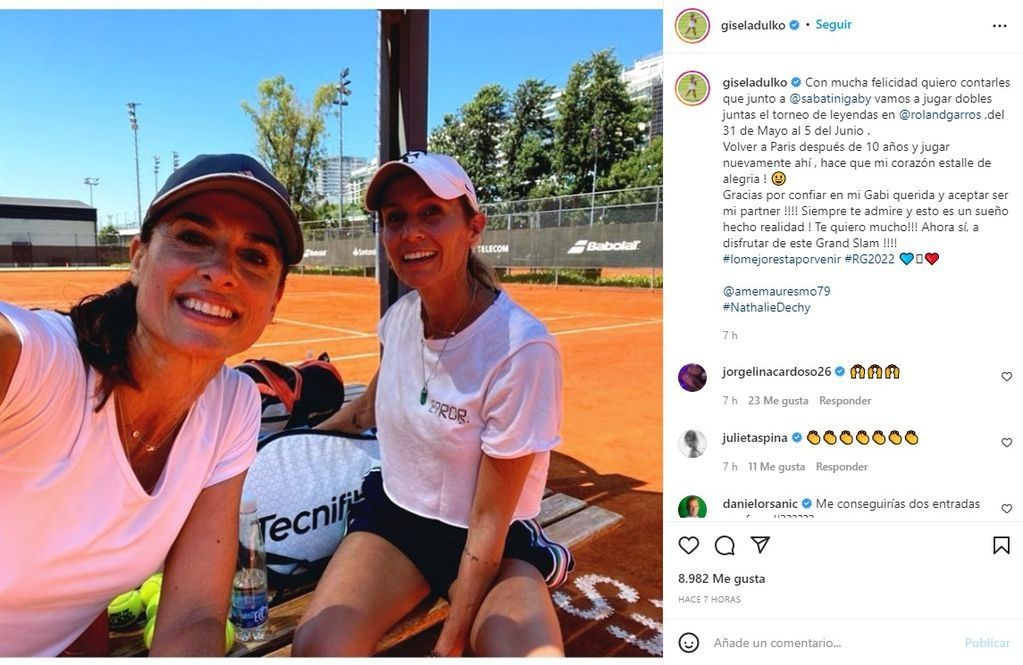 Por su lado, y ante tal blanqueo, Gisela Dulko decidió dar un anuncio importante para su vida. “Volver a París después de 10 años y jugar nuevamente ahí hace que mi corazón estalle de alegría. Gracias por confiar en mí, Gabi querida, y aceptar ser mi partner. Siempre te admiré y esto es un sueño hecho realidad. Te quiero mucho”, escribió la tenista junto a una postal con Gabriela Sabatini.