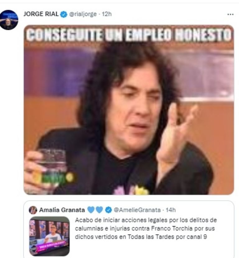 Por su parte, Amalia Granata respondió con dureza al anunciar: “Acabo de iniciar acciones legales por los delitos de calumnias e injurias contra Franco Torchia por sus dichos vertidos en Todas las Tardes por El Nueve?.