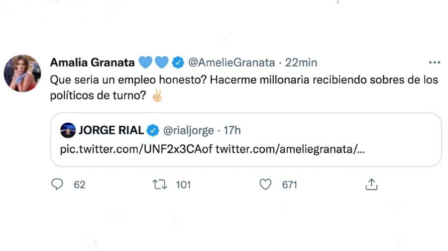 Granata no se quedó callada y le retrucó a Rial: “¿Qué sería un empleo honesto? ¿Hacerme millonaria recibiendo sobres de los políticos de turno?”. Además, sumó un emoji de una mano con los dedos en V, signo relacionado con el peronismo.