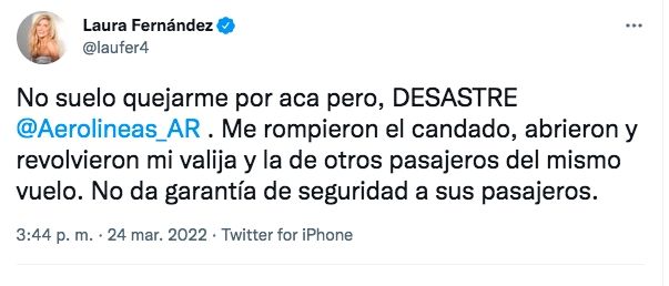 "No suelo quejarme por acá pero, desastre Aerolíneas Argentinas", comenzó diciendo Fernández, visiblemente enojada por lo que le tocó vivir. Acto seguido, detalló cómo encontró sus pertenencias: "Me rompieron el candado, abrieron y revolvieron mi valija y la de otros pasajeros del mismo vuelo. No da garantía de seguridad a sus pasajeros".