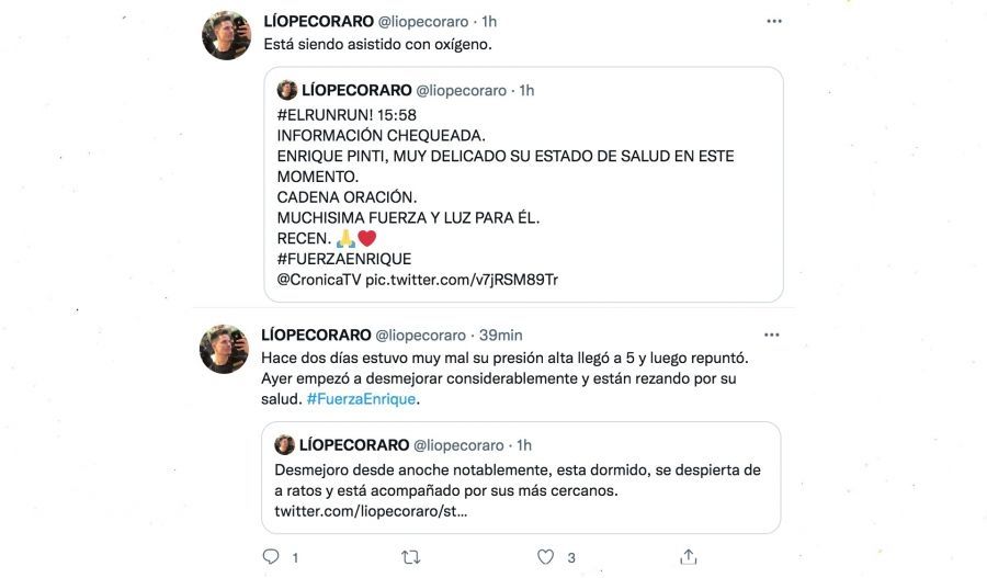 Recordemos que a principios de marzo, el artista había sido internado en el Sanatorio Otamendo tras una descompensación. Ahora, según Pecorraro, Enrique Pinti "desmejoró desde anoche notablemente, está dormido, se despierta de a ratos y está acompañado por sus más cercanos".