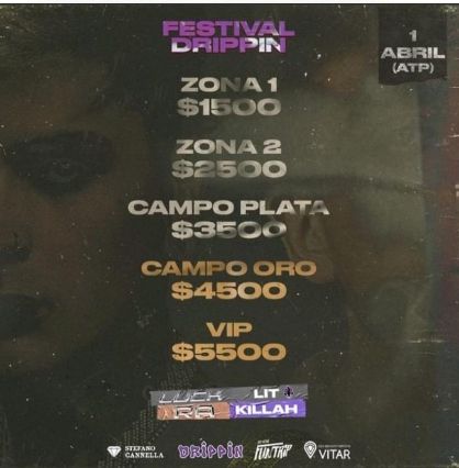 El evento será apto para todo público y los niños hasta 6 años no pagarán entrada. Los tickets se podrán adquirir por internet entrando a https://ticketpass.apphb.com/evento/755/festival-dripping-w-lit-killah// ; presencial en Stefano Canella Joyería ( sucursales en Rivadavia 98 y Las Heras 260 Ciudad, Mendoza) y Agencia Ceo Vitar Turismo ( Las Heras 627 Ciudad, Mendoza). Lit Killa es uno de los artistas del momento y trae a la provincia furores como “La Trampa es Ley” y “Pa Co”.