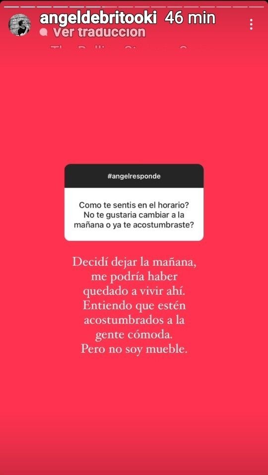 “¿Cómo te sentís en el horario? ¿No te gustaría cambiar a la mañana o ya te acostumbrarse?”, consultó un usuario. Ante esto, Ángel respondió con la picardía que lo caracteriza: “Decidí dejar la mañana. Me podría haber quedado a vivir ahí. Entiendo que estén acostumbrados a la gente cómoda, pero no soy mueble”.