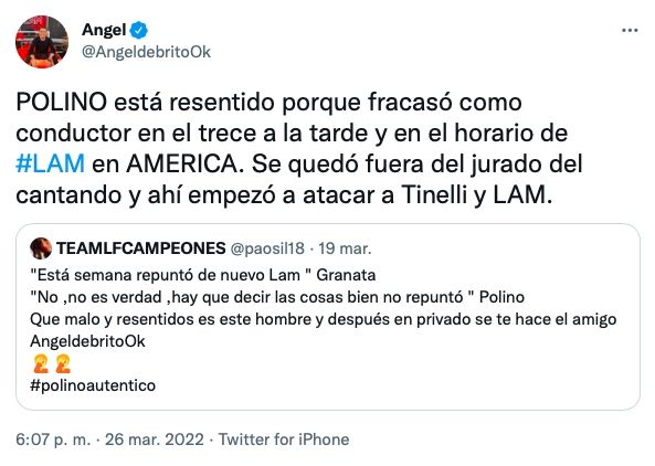 “POLINO está resentido porque fracasó como conductor en el trece a la tarde y en el horario de #LAM en AMÉRICA. Se quedó fuera del jurado del cantando y ahí empezó a atacar a Tinelli y LAM”, dijo de Brito sin filtro y ningún tipo de vueltas.