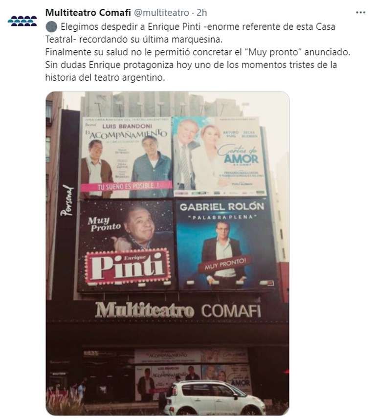 El empresario Carlos Rottenberg fue uno de los primeros en informar la noticia del fallecimiento del gran artista argentino. “Elegimos despedir a Enrique Pinti -enorme referente de esta Casa Teatral- recordando su última marquesina. Finalmente su salud no le permitió concretar el ‘Muy pronto’ anunciado. Sin dudas, Enrique protagoniza hoy uno de los momentos tristes de la historia del teatro argentino”, expresaron desde la cuenta del Multiteatro, propiedad del mencionado empresario teatral.