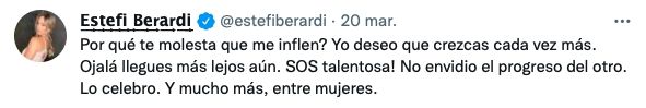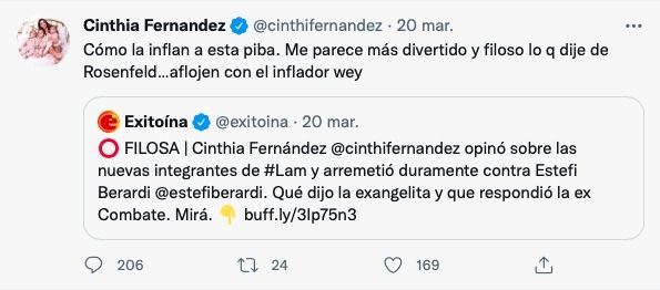 Seguido de toda esta explicación, Cinthia Fernández decidió bloquear a Berardi en Twitter. “Me bloquea, pero después reclama en televisión los temas pendientes que tiene conmigo. En vez de llamarme y decírmelos de frente. Seguramente si lo harías, te lo podría contar, lo entenderías y me pedirías disculpas”, le recriminó su colega.