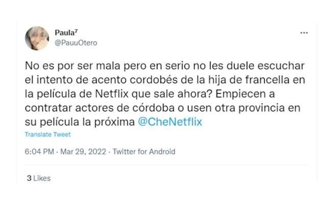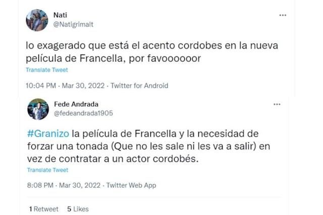 "Lo exagerado que está el acento cordobés en la nueva película de Francella, por favooooooor", “Granizo, la película de Francella y la necesidad de forzar una tonada, que no les sale ni les va a salir, en vez de contratar a un actor cordobés”, “No es por ser mala, pero ¿en serio no les duele escuchar el intento de acento cordobés de la hija de Francella en la película de Netflix que sale ahora? Empiecen a contratar actores de Córdoba o usen otra provincia en su película la próxima”; fueron algunos de los mensajes de enojo que circularon en Twitter.