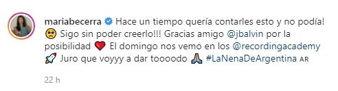 Así lo confirmaron los organizadores a través de un posteo en sus redes sociales que dice: "Qué va a pasar cuando María Becerra tome el escenario de los Grammys con J Balvin? No te pierdas su performance en la noche más grande de música el 3 de abril".