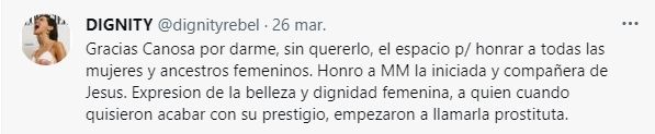 Las palabras de la conductora de Viviana con vos (A24) no pasaron desapercibidas por la actriz, quien decidió salir a responderle. "Gracias Canosa por darme, sin quererlo, el espacio p/ honrar a todas las mujeres y ancestros femeninos. Honro a María Magdalena la iniciada y compañera de Jesus. Expresión de la belleza y dignidad femenina, a quien cuando quisieron acabar con su prestigio, empezaron a llamarla prostituta", comenzó diciendo desde su cuenta de Twitter.