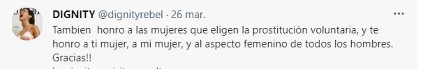 Luego, agregó: "También honro a las mujeres que eligen la prostitución voluntaria, y te honro a ti mujer, a mi mujer, y al aspecto femenino de todos los hombres. Gracias", finalizó.