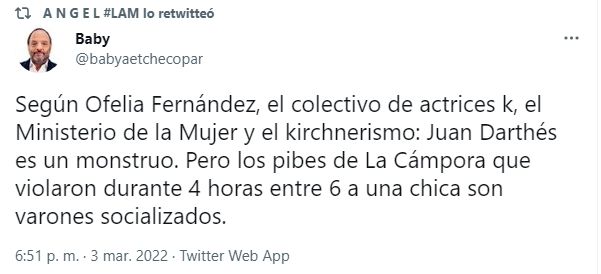 Tras las repercusiones de sus dichos, fue el propio Etchecopar quien salió al cruce de la joven legisladora, acusándola de tener una doble vara moral feminista. "Según Ofelia Fernández, el colectivo de actrices k, el Ministerio de la Mujer y el kirchnerismo: Juan Darthés es un monstruo. Pero los pibes de La Cámpora que violaron durante 4 horas entre 6 a una chica son varones socializados", disparó sin vueltas el periodista en su cuenta de Twitter.
