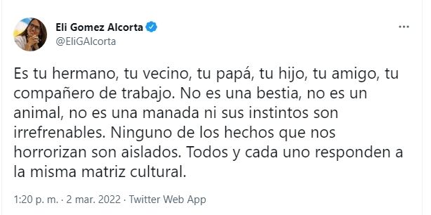 "Es tu hermano, tu vecino, tu papá, tu hijo, tu amigo, tu compañero de trabajo. No es una bestia, no es un animal, no es una manada ni sus instintos son irrefrenables. Ninguno de los hechos que nos horrorizan son aislados. Todos y cada uno responden a la misma matriz cultural", aseguró la ministra en una serie de tiuts publicados en su cuenta personal, a los que Ofelia compartió.