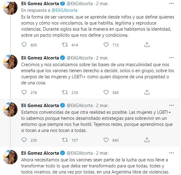"Es tu hermano, tu vecino, tu papá, tu hijo, tu amigo, tu compañero de trabajo. No es una bestia, no es un animal, no es una manada ni sus instintos son irrefrenables. Ninguno de los hechos que nos horrorizan son aislados. Todos y cada uno responden a la misma matriz cultural", aseguró la ministra en una serie de tiuts publicados en su cuenta personal.