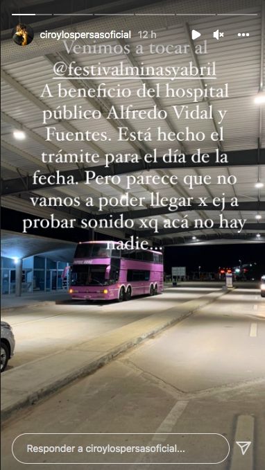 "Venimos a tocar al Festival Minas y Abril a beneficio del Hospital público Alfredo Vidal y Fuentes, Está hecho el trámite para el día de la fecha, pero parece que no vamos a poder llegar por ejemplo a probar sonido porque acá no hay nadie", escribió en una primera historia con una foto en la que muestra el paso fronterizo completamente vacío.