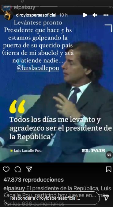 Pasadas algunas horas, volvió a volcarse a su cuenta de Instagram. En esta oportunidad compartió una nota del mandatario Luis Lacalle Pou titulada "Todos los días me levanto y agradezco ser el presidente de la república". A lo que el músico comentó: "Levántese pronto presidente que hace cinco horas estamos golpeando la puerta de su querido país, tierra de mi abuelo, y acá n nos atiende nadie".