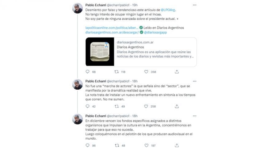 De esta manera, Echarri desestimó la posibilidad de ser el reemplazo de Luis Puenzo. "Desmiento por falso y tendencioso este artículo de ?@LPOArg. No tengo interés de ocupar ningún lugar en el INCAA. No soy parte de ninguna avanzada sobre el presidente actual", apuntó el artista.