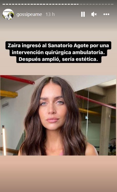 "Zaira Nara ingresó al Sanatorio Agote por una intervención quirúrgica ambulatoria. Sería estética. Después amplío", anunció la cuenta de chimentos de Instagram @gossipeame, que suele brindar datitos muchas veces jugosos sobre los movimientos de las celebridades.
