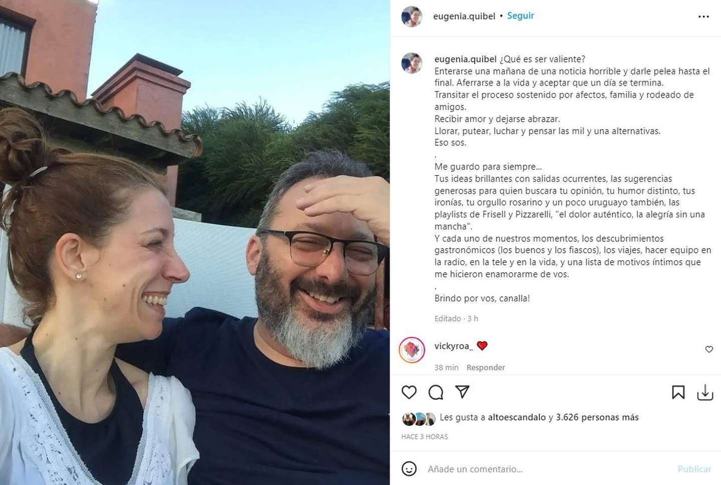 En aquellos tristes días, Eugenia Quibel compartió en la red una foto junto a Gerardo Rozín y escribió en el epígrafe unas sentidas palabras dedicadas a su gran amor. “Me guardo para siempre... Tus ideas brillantes con salidas ocurrentes, las sugerencias generosas para quien buscara tu opinión, tu humor distinto, tus ironías, tu orgullo rosarino y un poco uruguayo también, las playlists de Frisell y Pizzarelli, ‘el dolor auténtico, la alegría sin una mancha. Brindo por vos, ¡canalla!”, escribió en esa oportunidad la locutora.