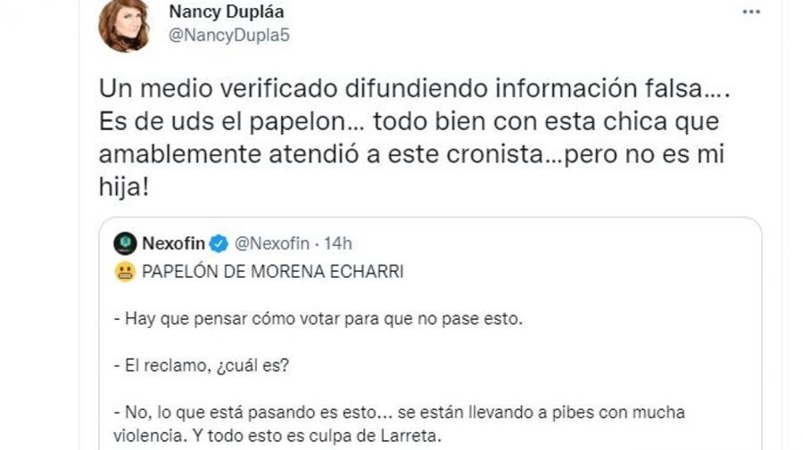 Apenas tomó conocimiento de la situación, Nancy Dupláa compartió un fuerte mensaje en Twitter en el que sentenció: "Un medio verificado difundiendo información falsa... Es de ustedes el papelón. Todo bien con esta chica que amablemente atendió a este cronista. Pero no es mi hija".