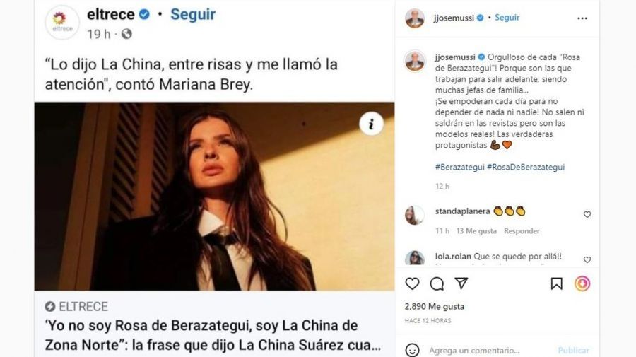 Luego, el intendente de Berazategui Juan José Mussi se sumó a la polémica con un errático posteo que decía: "Estoy orgulloso de cada Rosa de Berazategui, porque son las que trabajan para salir adelante, siendo muchas jefas de familia... ¡Se empoderan cada día para no depender de nada ni nadie! No salen ni saldrán en las revistas pero son las modelos reales! Las verdaderas protagonistas".