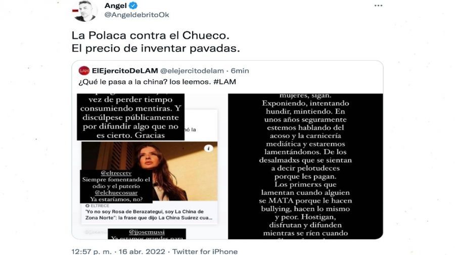 De Brito retuiteó un posteo de la cuenta de LAM (América), con el posteo de la China contra El Trece y su gerente de programación, Adrián Suar. Sin dar nombres, aunque evidentemente refiriéndose a Mariana Brey y Socios del Espectáculo, el conductor sentenció picante: "La Polaca contra el Chueco. El precio de inventar pavadas".