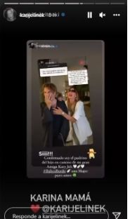 “Eso me prometió y yo acepté feliz porque ama a los niños y hace mucho tiempo hablamos del tema y creo que falta menos. Igual pregúntenle a ella. ¿Voy a ser el padrino Karina?", publicó. Y Jelinek se sumó para darle sustancia a la noticia: “Si”.