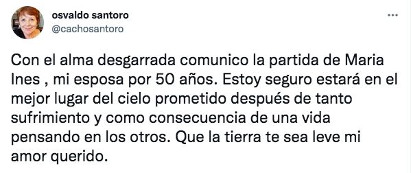 "Con el alma desgarrada comunico la partida de María Inés, mi esposa por 50 años", publicó en sus redes sociales Osvaldo Santoro, confirmando la triste noticia del fallecimiento de su mujer. "Estoy seguro que estará en el mejor lugar del cielo prometido después de tanto sufrimiento y como consecuencia de una vida pensando en los otros. Que la tierra te sea leve mi amor querido", finalizó el desgarrador mensaje.