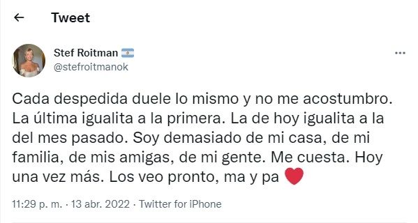 En su cuenta de Twitter, Stefi compartió con sus seguidores lo complejo que resultan las despedidas de sus seres queridos, y más en estos momentos en los que pasa poco tiempo con ellos entre idas y vueltas.