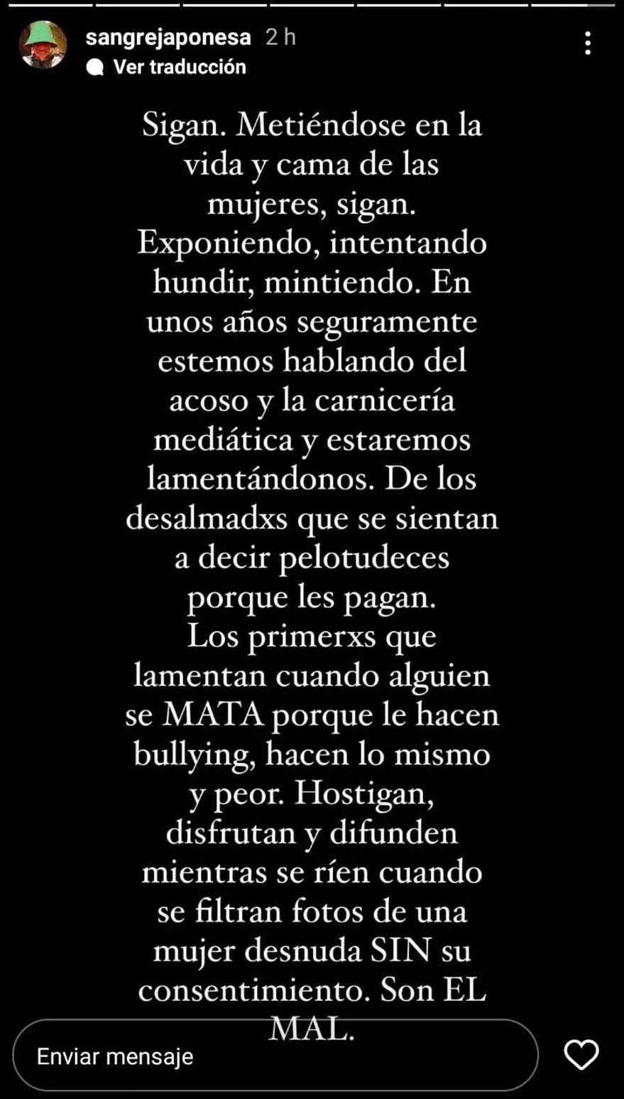 “Sigan metiéndose en la cama y en la vida de las mujeres. Exponiendo, intentando hundir, mintiendo. En unos años, seguramente, estaremos hablando del acoso y la carnicería mediática, y lamentándonos de los desalmados que se sientan a decir pelotudeces porque les pagan”, publicó la ex de Benjamín Vicuña.