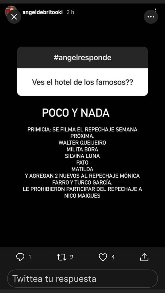 De este modo, el animador de América soltó una serie de primicias al respecto al responder: “Poco y nada. Primicia: se filma el repechaje la semana próxima, Walter Queijeiro, Milita Bora, Silvina Luna, Pato y Matilda”. Una especie de pronóstico anticipado.
