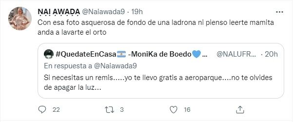 Una usuaria de Twitter le contestó, de forma irónica, que si necesitaba un remis, ella la llevaba “gratis a aeroparque”. Sobre esto, Nai no quiso quedarse callada y salió con lo tapones de punta.