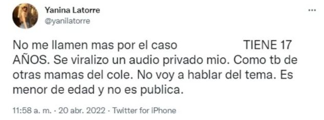 Tras las repercusiones de la noticia, Latorre hizo un descargo en las redes sociales, donde explicó que el audio que se viralizó corresponde al ámbito de su vida privada. Que no expondrá en nombre de la menor y disparó contra las madres del colegio por "chusmas".