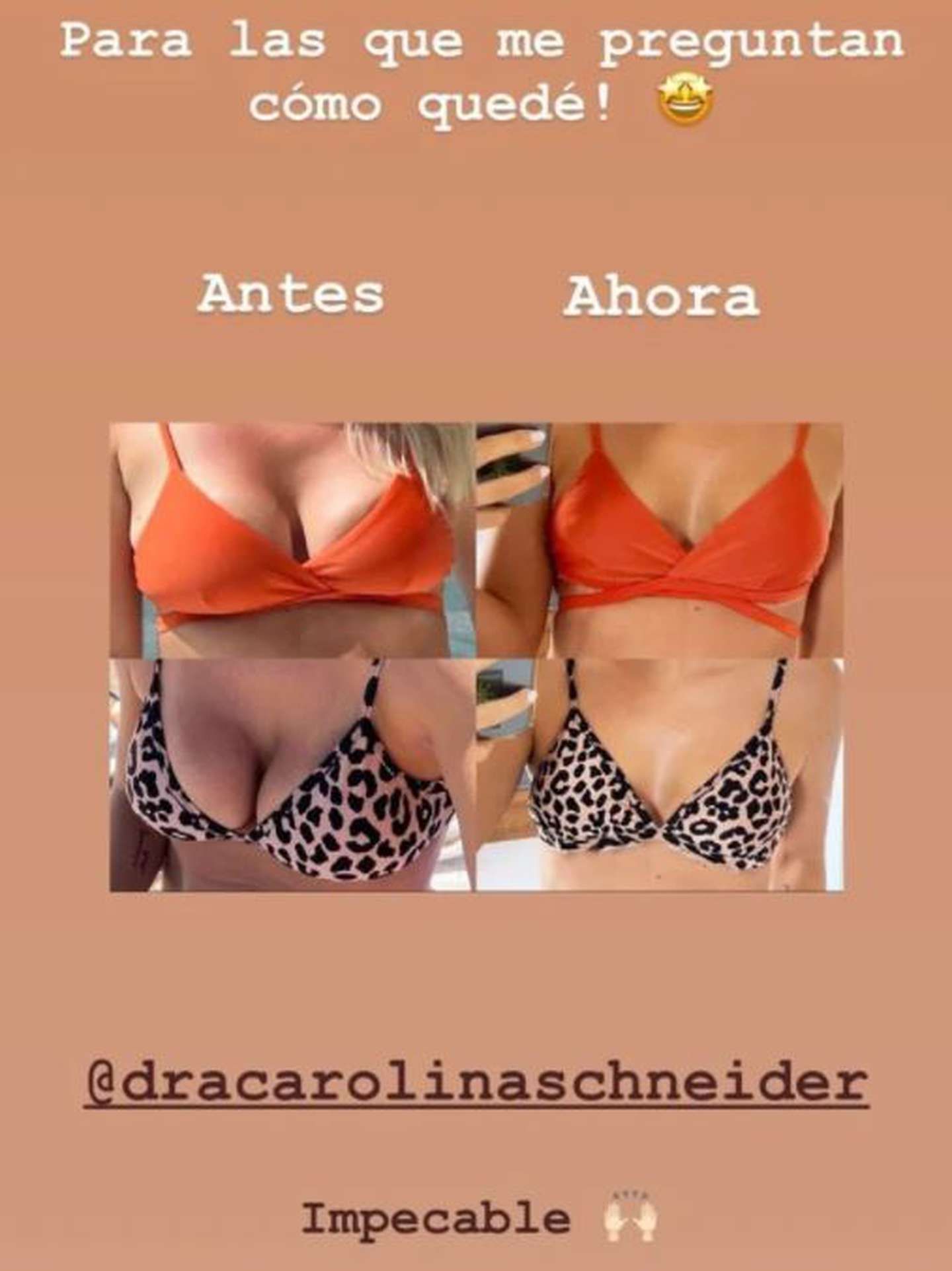 Graficando el antes y el después con el mismo traje de baño, Carolina Oltra demostró que el cambio estético es mínimo, pero la ganancia en salud es enorme. "Impecable", escribió en la postal que publicó en sus historias de Instagram.