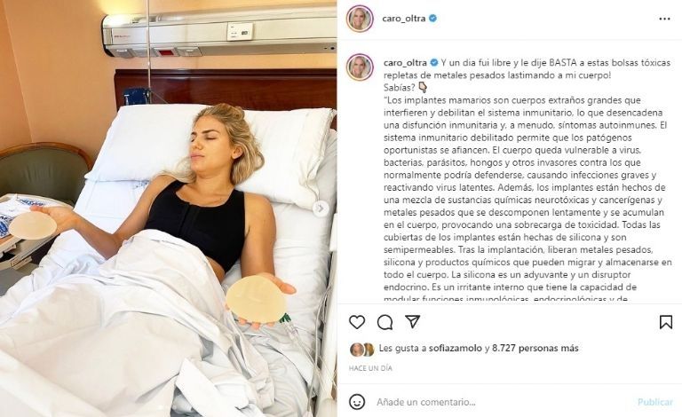 Oltra calificó a estos implantes de “bolsas tóxicas repletas de metales pesados”, y señaló que este producto puede causar cientos de daños en el organismo. De esta manera, a los 37 años Carolina decidió apostar a la recuperación de su cuerpo en su forma más natural y en esta oportunidad se dispuso a mostrar el resultado de su operación.