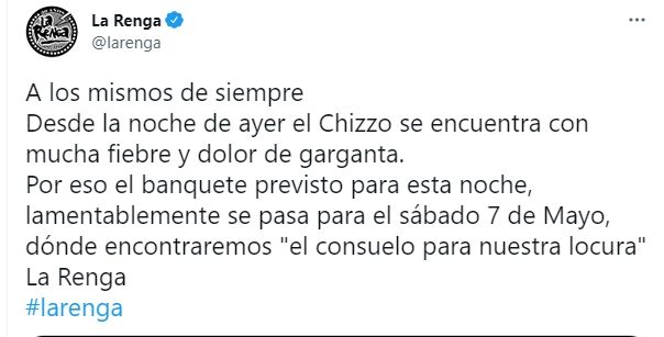 "Desde la noche de ayer el Chizzo se encuentra con mucha fiebre y dolor de garganta. Hoy no puede ni hablar, mucho menos tocar y cantar. Por eso el banquete previsto para esta noche, lamentablemente se pasa para el sábado 7 de mayo, dónde encontraremos ´el consuelo para nuestra locura´", expresaron en un comunicado que publicaron en sus rede sociales, en referencia al estado de salud de Gustavo Chizzo Nápoli, cantante y líder del grupo.