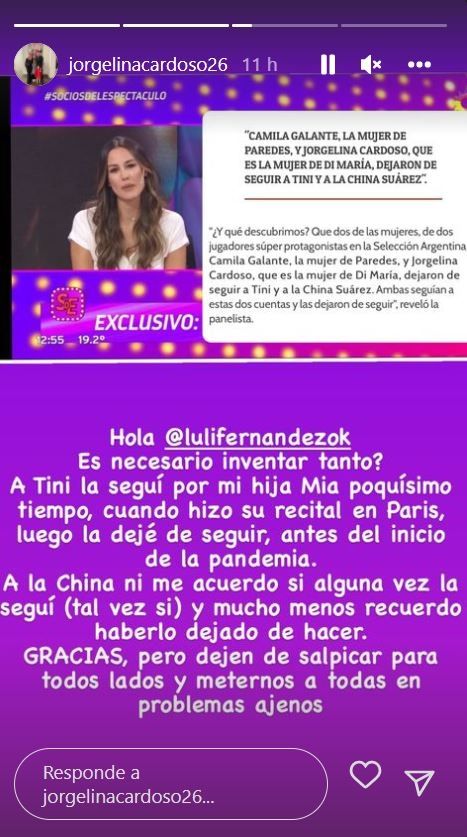 La pareja de Carlos Di María la etiquetó en una historia y le dejó un furioso mensaje de descargo. “Hola @lulifernándezok. ¿Es necesario inventar tanto? A Tini la seguí por mi hija Mía poquísimo tiempo, cuando hizo su recital en París, luego la dejé de seguir, antes del inicio de la pandemia”, empezó.