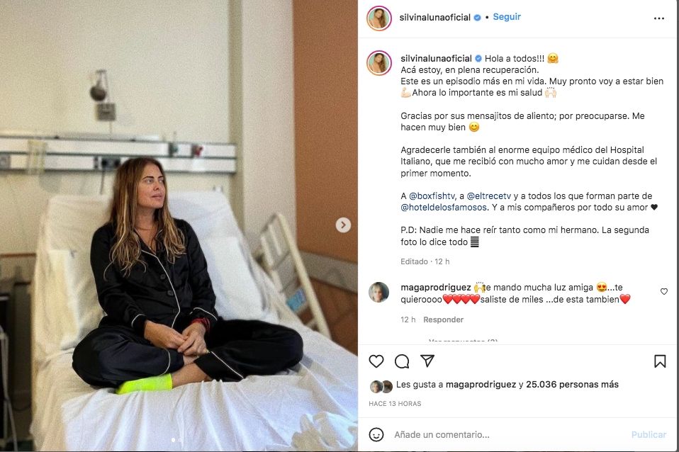 Por otra parte, Silvina compartió un mensaje para ponderar la atención de El hotel de los famosos, lo que permitió desbaratar las versiones de una tensión con la producción del reality. “Agradecerle también al enorme equipo médico del Hospital Italiano, que me recibió con mucho amor y me cuidan desde el primer momento. A eltrece y a todos los que forman parte del programa y a mis compañeros por todo su amor”.