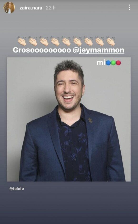 A través de sus historias de Instagram, Zaira Nara una foto promocional de la nueva figura de Telefe y expresó: "Grosooooo Jey Mammon".